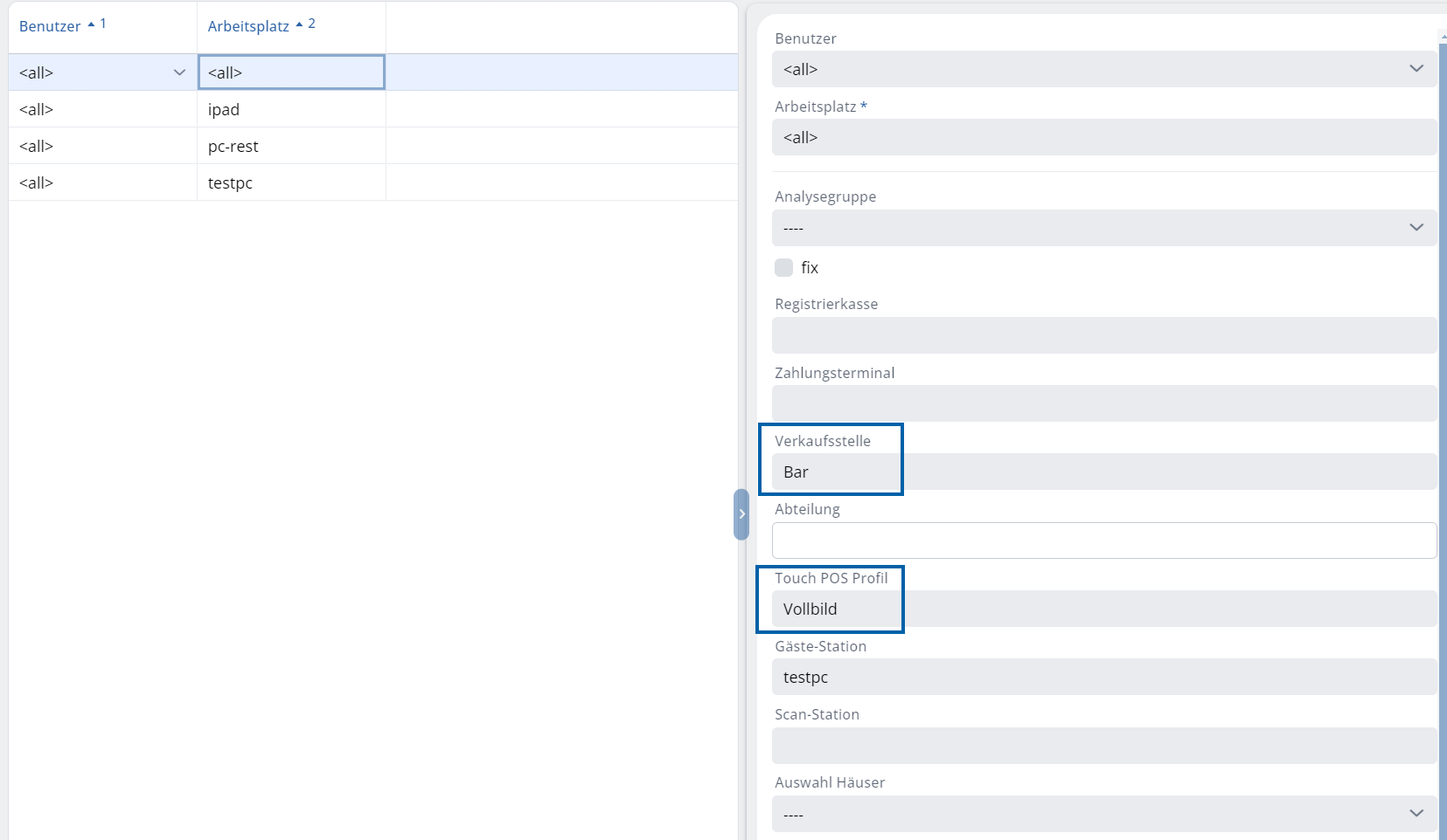 Pro Benutzer oder Arbeitsplatz können diverse Verkaufsstellen und Touch POS Profile hinterlegt werden