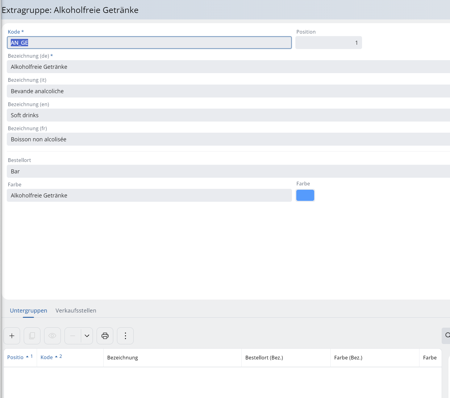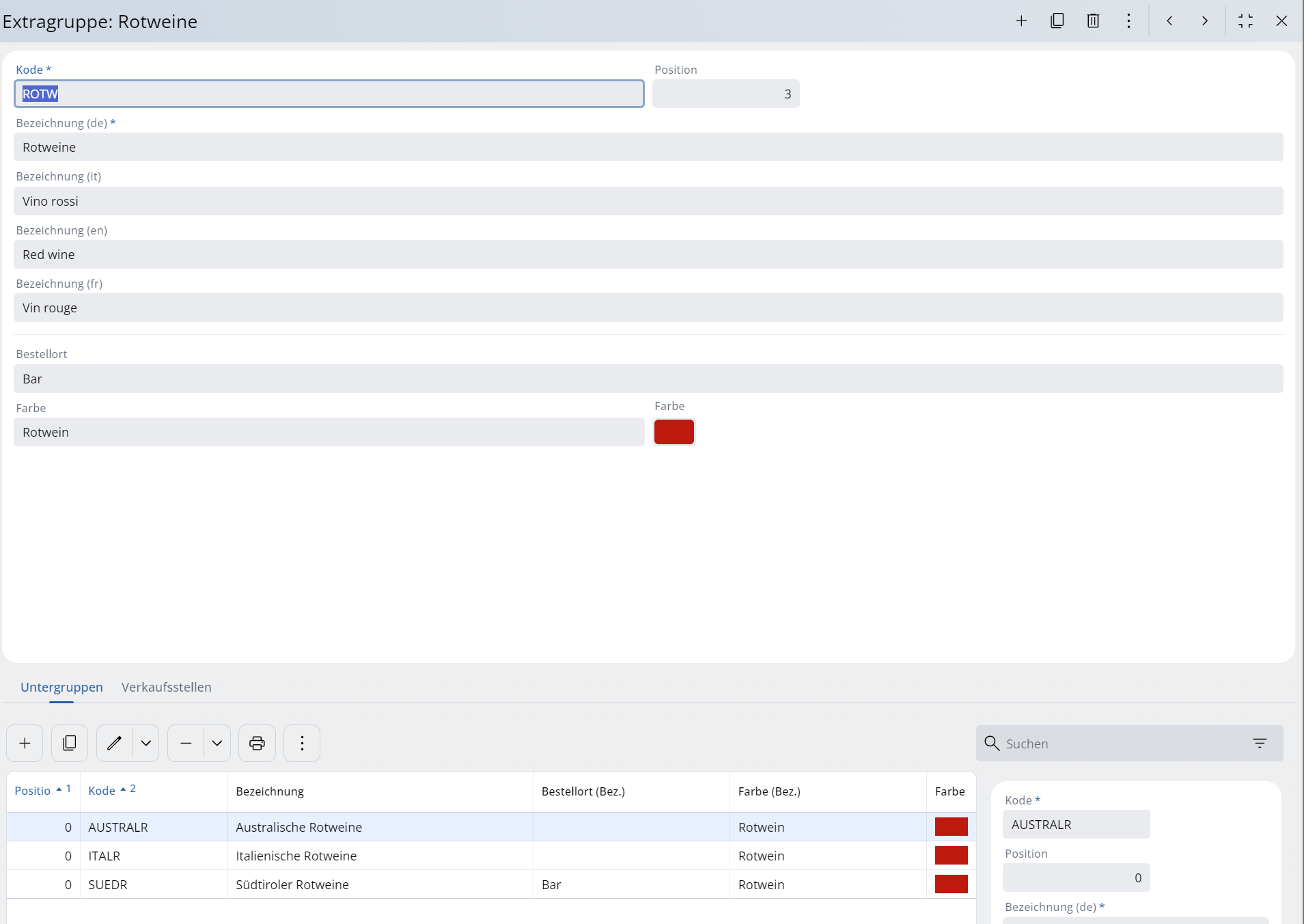 Bei sehr vielen Extragruppen können diese auch in Untergruppen (z.B. Extragruppe Rotwein in Untergruppen italienische Rotweine, Südtiroler Rotweine,..) unterteilt werden. In diesem Fall werden diese dann automatisch in einer eigenen Spalte (neben Extragruppe) angeordnet. Bei Angabe einer Verkaufsstelle wird die Extragruppe bzw. Untergruppe nur bei dieser Verkaufsstelle angezeigt.
