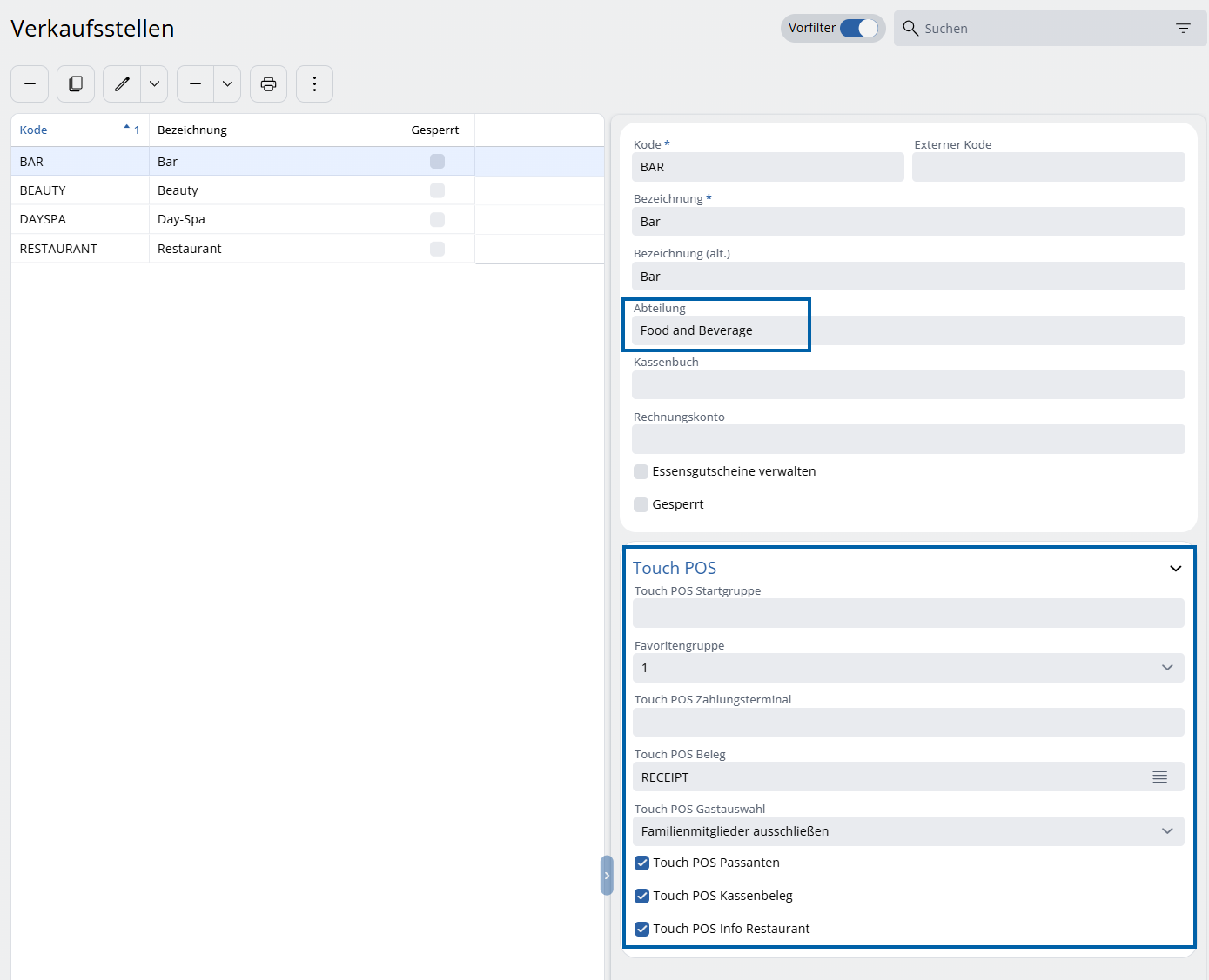 Diverse Touch POS Einstellungen finden sich in den Verkaufsstellen