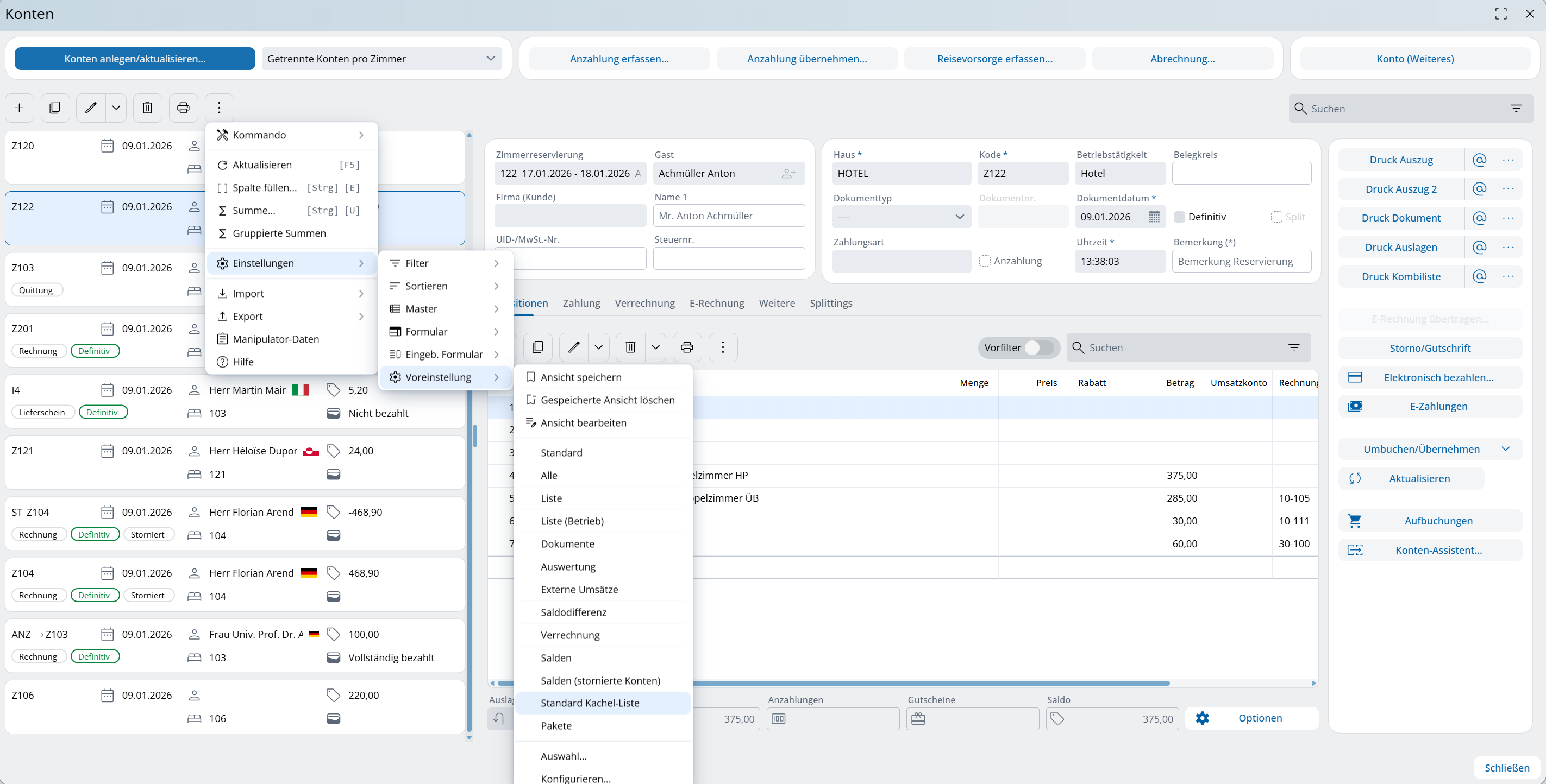 In den Konten wurde die Ansicht mit der Standard-Kachel-Liste erweitert, welche ab sofort für alle Anwender zur Verfügung steht. Diese Ansicht dient zur Optimierung der Übersichtlichkeit und bietet bei der Verwaltung umfangreicher Reservierungsgruppen erhebliche Vorteile. Die einzelnen Konten werden hierbei strukturiert als Kachel am linken Rand positioniert. Jede Kachel liefert auf einen Blick alle relevanten Informationen, darunter den Kode, den aktuellen Saldo, den Gastnamen oder die Firma sowie die Zimmernummer. Zudem ist der Zahlungsstatus ersichtlich und unterscheidet zwischen nicht bezahlt, teilweise bezahlt und vollständig bezahlt.