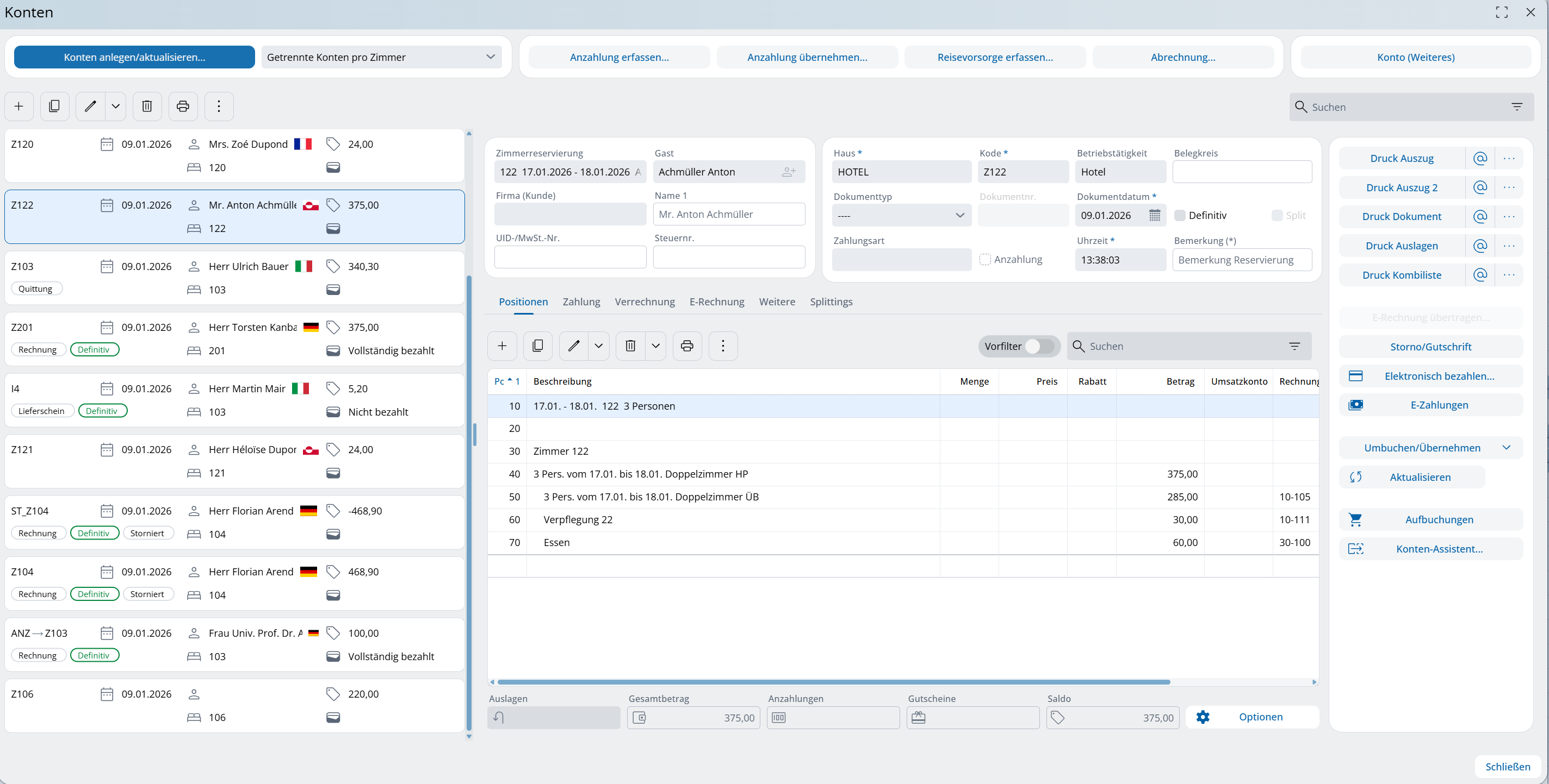 Ein Paar hat für sich und die Eltern bzw. Schwiegereltern zwei Zimmer reserviert. Beim Abrechnen wird die Option "Getrennte Konten pro Zimmer" gewählt. Anschließend sollen aber bestimmte Extras noch auf das andere Zimmer umgebucht werden.
