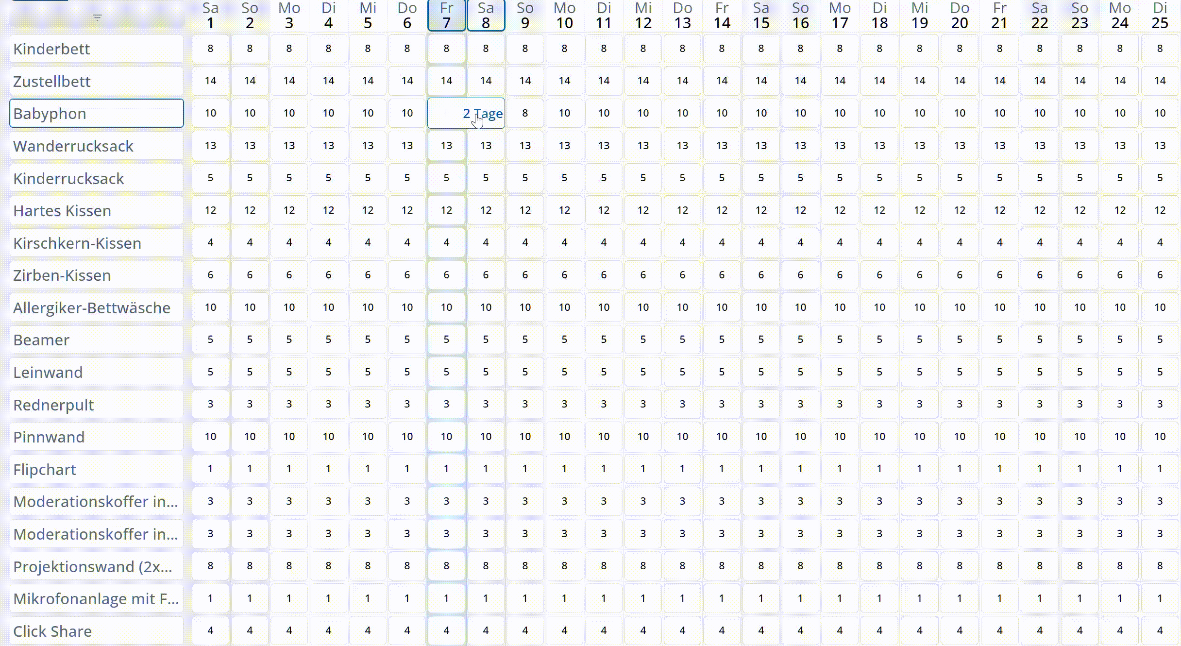 Der Ressourcenplan bietet eine Übersicht über die zur Verfügung stehenden Ressourcen, wie beispielsweise E-Bikes, Babystühle, Beamer, Mikrofone, etc.