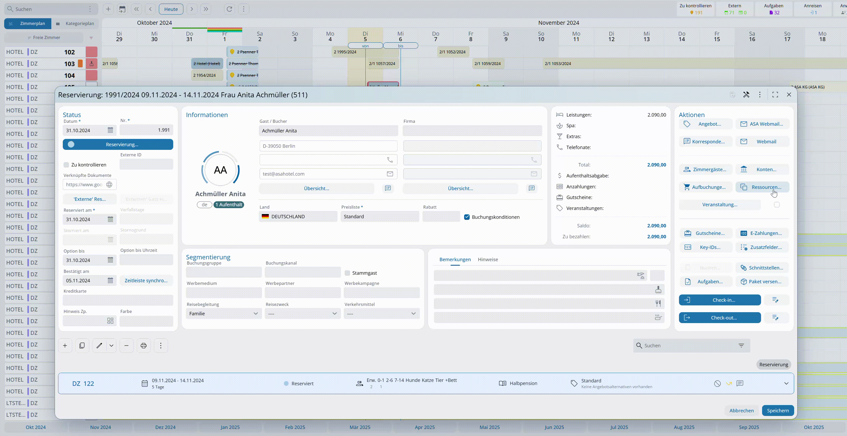 - Direkt vom Ressourcenplan (Menü » Hotel » Bewegungen » Ressourcenplan) mit anschließender Verknüpfung mit der gewünschten Reservierung
