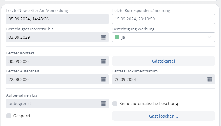 Das Feld „berechtigtes Interesse bis“ ist das einzige der vier Datumsfelder in diesem Abschnitt, dessen Datum in der Zukunft liegen kann. ASA HOTEL berechnet je nach in der Systemeinstellung hinterlegter Frist dieses Datum.