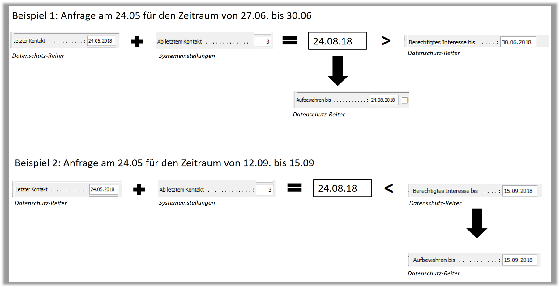| Hätte derselbe Gast für den Zeitraum vom 12.09 bis zum 15.09 angefragt, dann wäre im Feld „berechtigtes Interesse bis“ der 15.09 eingetragen worden. Das höhere Datum wäre folglich der 15.09 („berechtigtes Interesse“) im Vergleich zum berechneten Datum (24.08). Im Feld „Aufbewahren bis“ würde in diesem Fall der 15.09 eingetragen werden. |