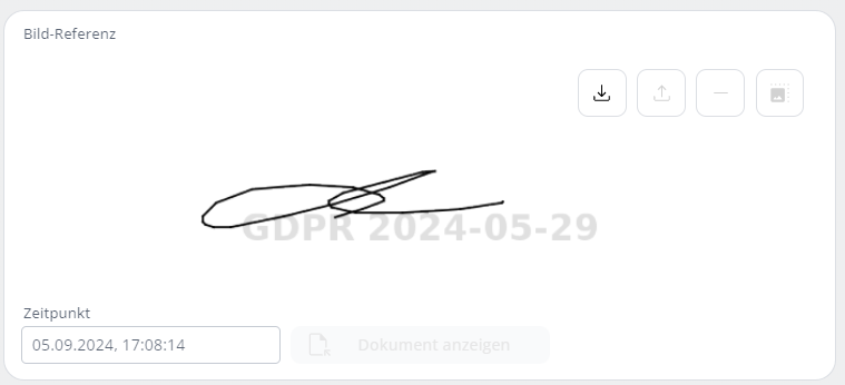 Wird die Einwilligungserklärung via Tablet eingeholt (eigenes Modul) wird die Unterschrift des Gastes in diesem Feld gespeichert und kann jederzeit abgespielt werden. Wird die Einwilligungserklärung ausgedruckt, wird die Unterschrift auf dem Druck mit Wasserzeichen abgebildet.