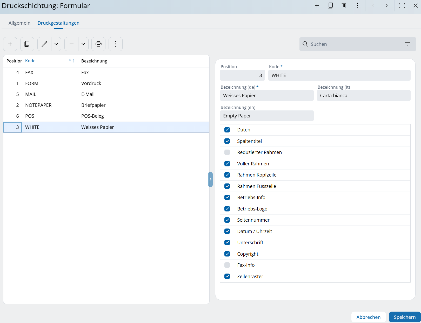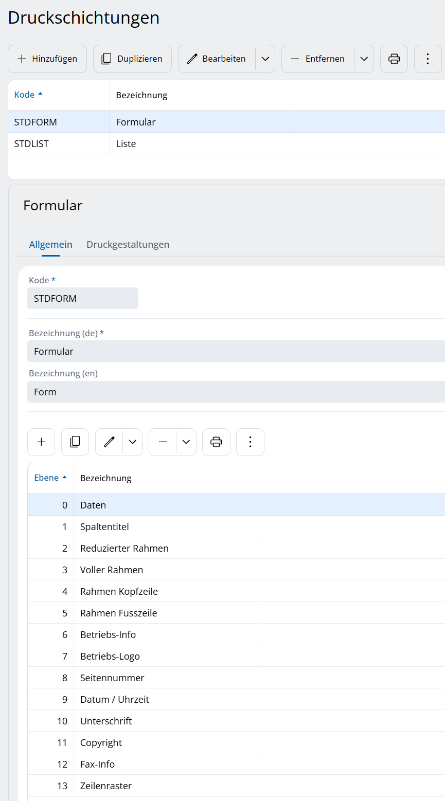 Im Reiter „Druckgestaltungen“ können pro Druckformular verschiedene Druckschichtungen ausgewählt werden. So lässt sich individuell festlegen, welche Inhalte beim Ausdruck erscheinen sollen.