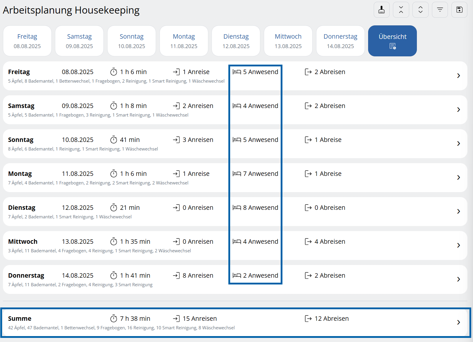 - In der Arbeitsplanung Housekeeping wird nun in der Übersicht zusätzlich zu den Wochentags-Karten eine Summen-Karte angezeigt. Zusätzlich werden in der Übersicht die anwesenden Zimmerreservierungen angezeigt. Auch im Web-Client werden anwesende Zimmerreservierungen angezeigt.
