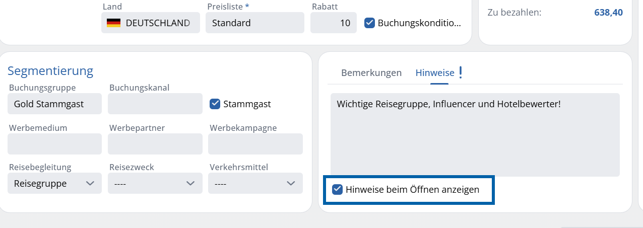 - Mit der neuen Check Box "Hinweise beim Öffnen anzeigen" in der Reservierung unter den Hinweisen wird beim Öffnen der Reservierung im Zimmerplan der Hinweis als Pop Up angezeigt.