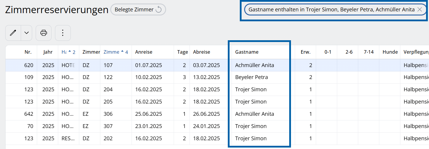 - Es werden nun auch Zimmergäste über Internet-Portale (Channelmanager usw.) eingelesen. Falls bei einem Zimmergast nur der Nach- oder Vorname angegeben wird, wird jeweils ein Fragezeichen eingesetzt. Beim Buchen der externen Reservierungen werden automatisch die eingelesenen Zimmergäste eingetragen. Beim Eintragen von Zimmergästen über externe Schnittstellen (Internet-Portale, Reservierungsdienst usw.) wird immer nach bereits registrierten Gästen gesucht, falls ein Geburtsdatum angegeben wurde (zur Vermeidung von Duplikaten).