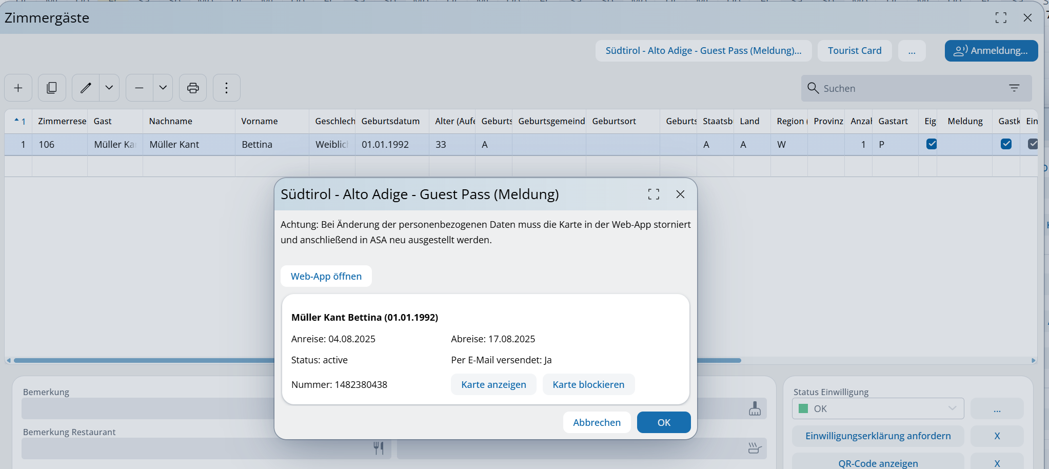 - Der Südtirol Guest Pass kann jetzt auch deaktiviert werden. Die Ausgabe der Fehlermeldungen wurde verbessert. Bei den Zimmergästen wurden außerdem zwei neue Felder hinzugefügt:
