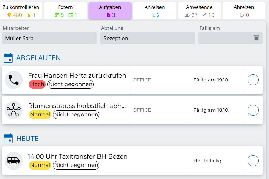 Der Aufgabenfilter in den Quick-Infos wurde überarbeitet. Der Mitarbeiter, der mit dem aktuell angemeldeten Benutzer verknüpft ist, sieht nun: