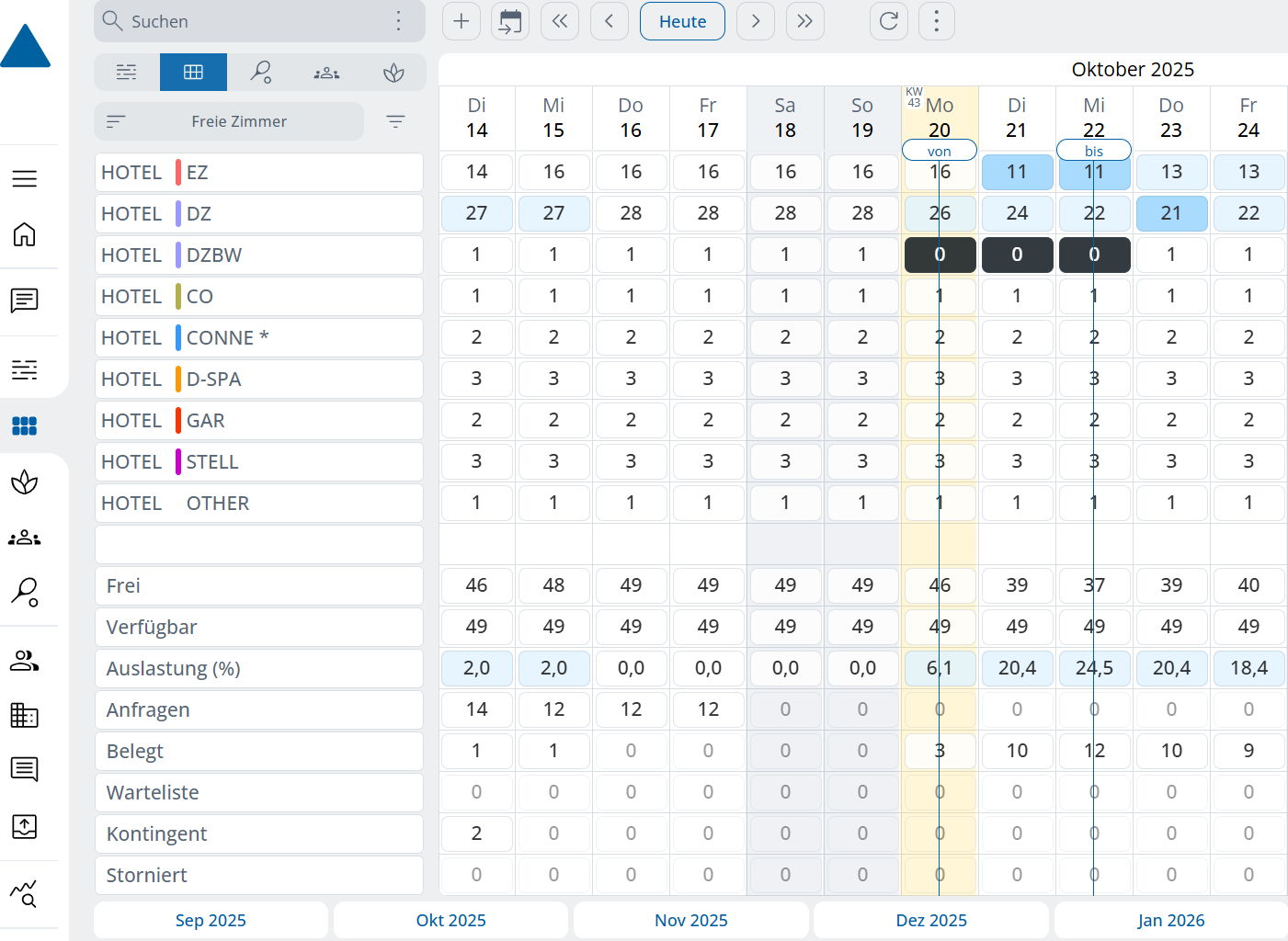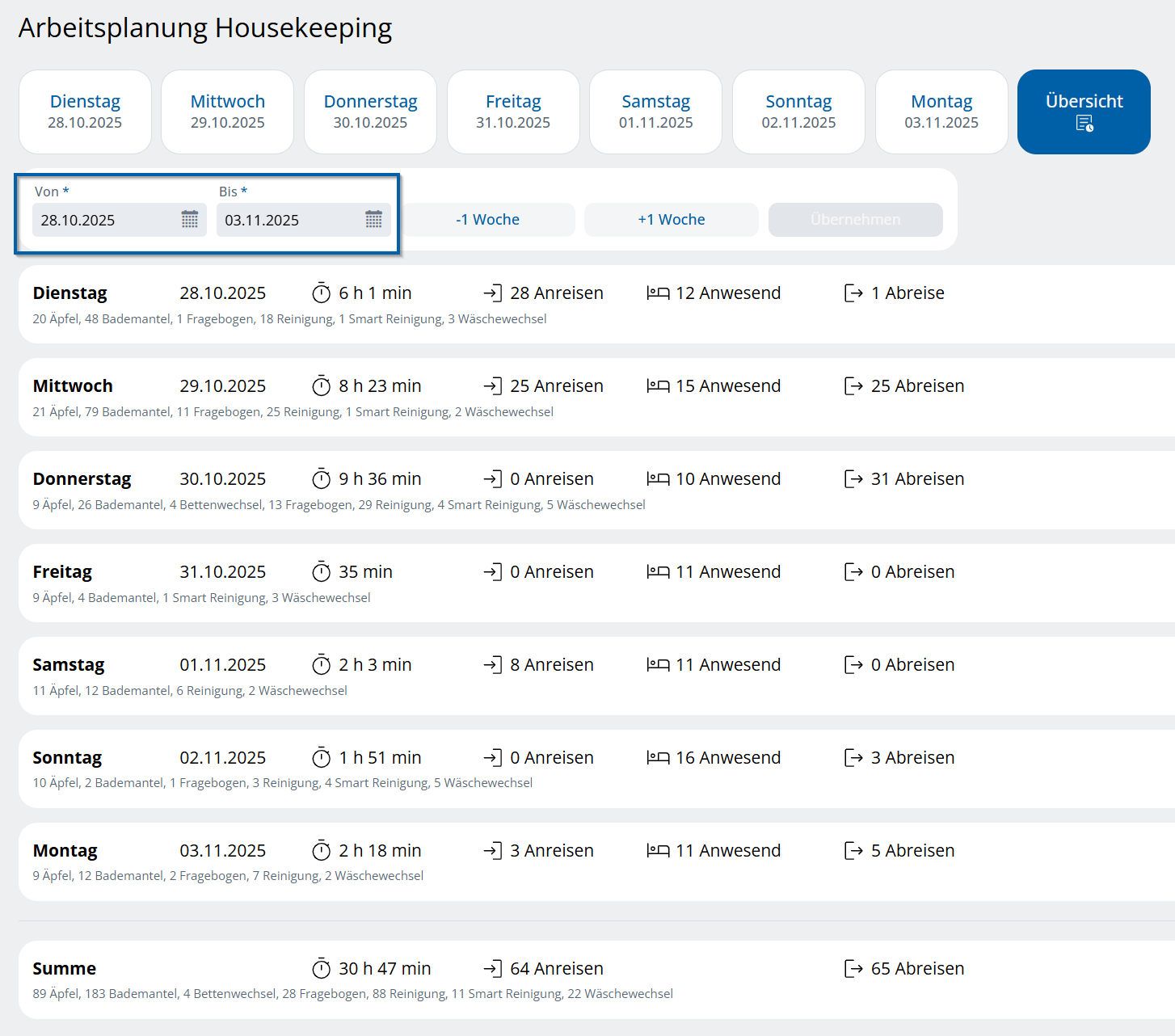 In der Housekeeping Arbeitsplanung Übersicht kann man nun ein Von- und Bis-Datum angeben.