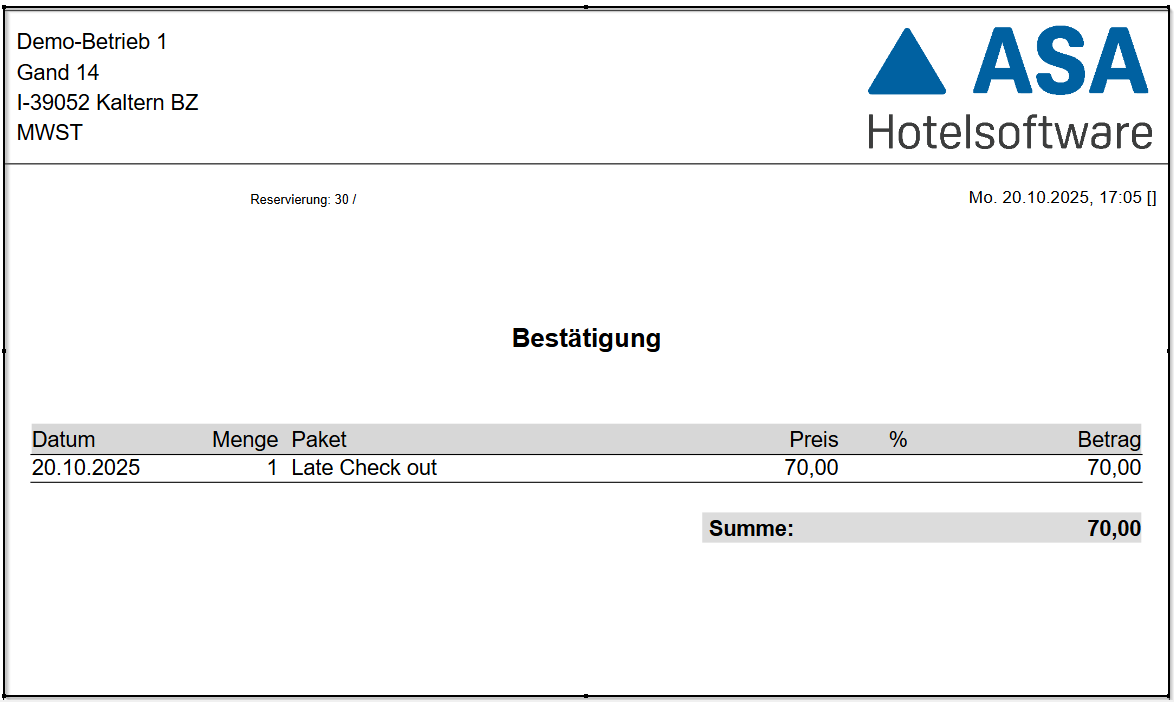 Um ein Spa-Paket für einen Gast auszudrucken, in der ausschließlich der Gesamtpreis ausgewiesen wird, sind folgende Schritte im Spa Manager zu befolgen: