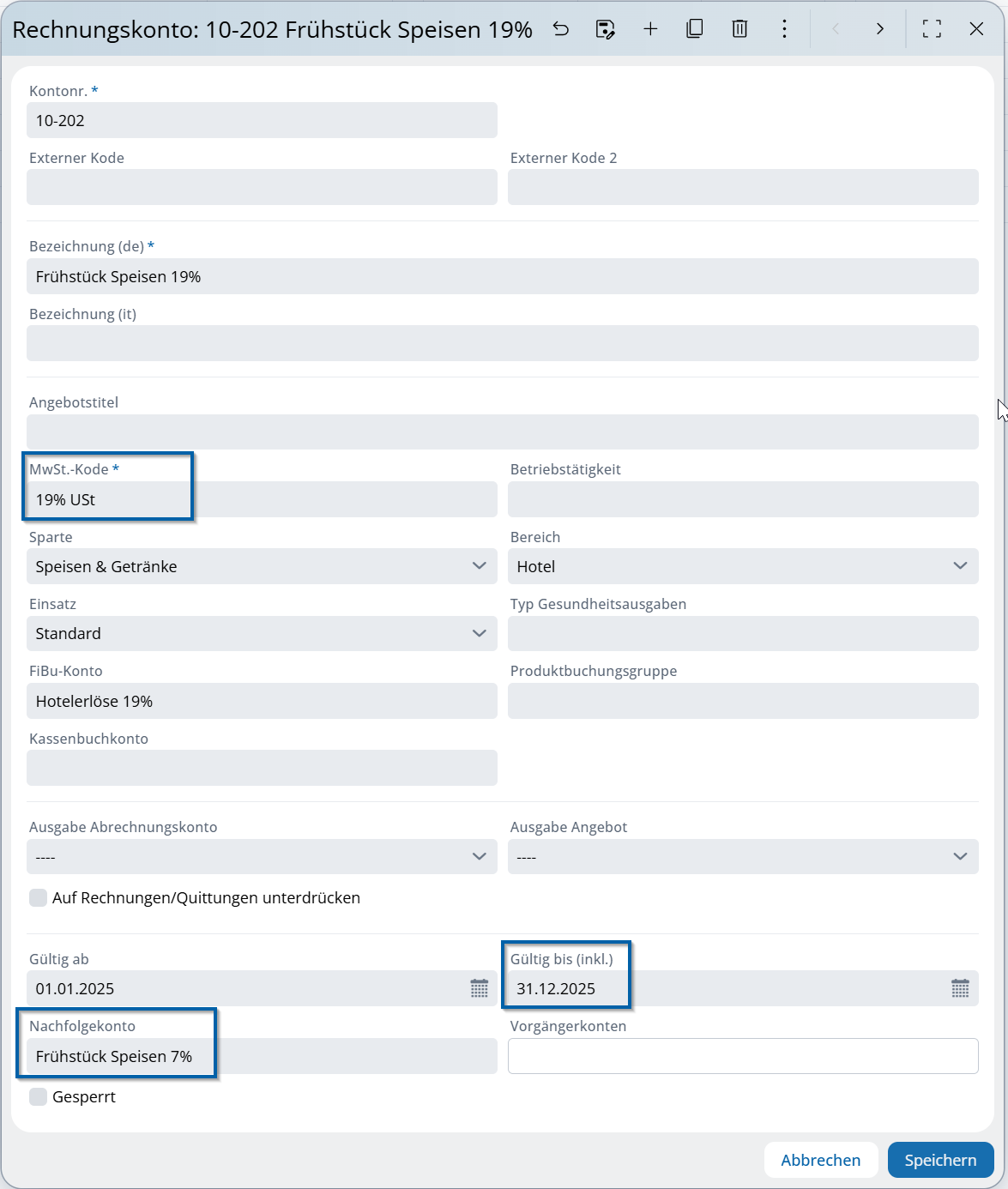 Achtung: Alle Betriebe, die bereits seit mehr als zwei Jahren mit ASA arbeiten (also vor 2024), sollten die beschriebenen Anpassungen erst vornehmen, nachdem die Version 25.09 (oder eine aktuellere) verfügbar ist. Damit die Nettobeträge für ältere Zeiträume in den Statistiken korrekt berechnet werden, werden beim Update ab Version 25.09 alle damals gültigen MwSt.-Sätze in den Statistikdaten historisiert. Dies ermöglicht anschließend den erneuten Einsatz der früheren Rechnungskonten mit 7% MwSt. In diesem Fall ist beim aktuellen Rechnungskonto mit 19% MwSt. als Nachfolgekonto das bereits bestehende mit 7% (z. B. Frühstück Speisen 7%) zu hinterlegen. Dabei ist „01.01.2026“ bei „Gültig ab“ einzutragen und der Eintrag bei „Gültig bis“ zu löschen. Der korrigierte Eintrag mit 7% MwSt. muss nach der Umstellung also genau so aussehen wie im ersten Screenshot oben.