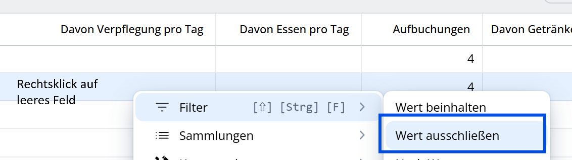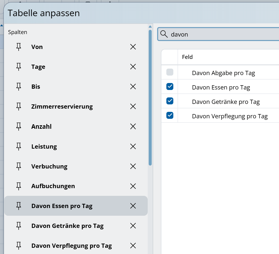 Mit „Tabelle anpassen“ die drei Felder für Ausgleiche „Davon Verpflegung pro Tag“, „Davon Essen pro Tag“ und „Davon Getränke pro Tag“ einblenden und eventuell nur Leistungen filtern, bei denen „Davon Verpflegung pro Tag“ nicht leer ist.