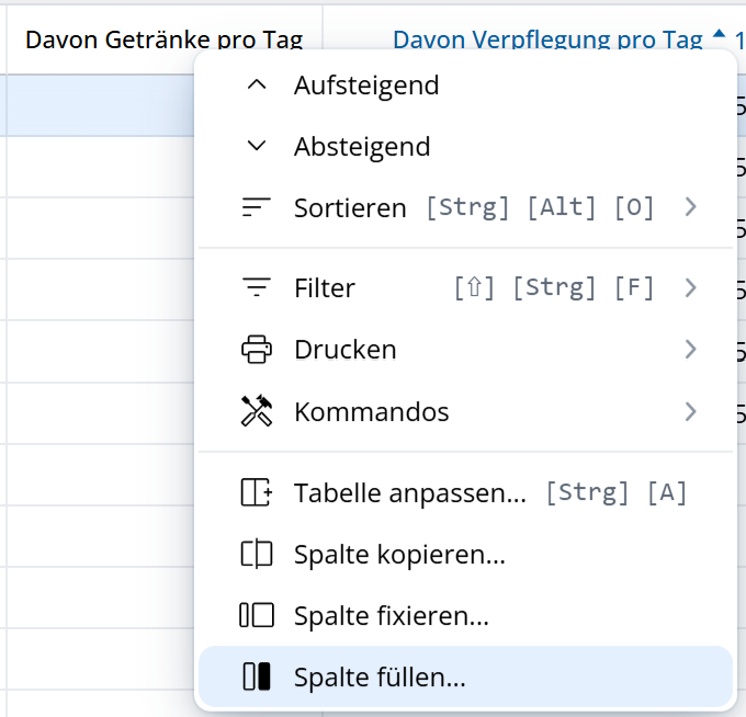 Beträge für die drei Ausgleiche können für alle gefilterten Leistungen mit „Spalte füllen“ sehr schnell korrigiert werden, sodass am Ende bei Verpflegung 0 und bei Getränke und Essen der entsprechende Anteil steht.