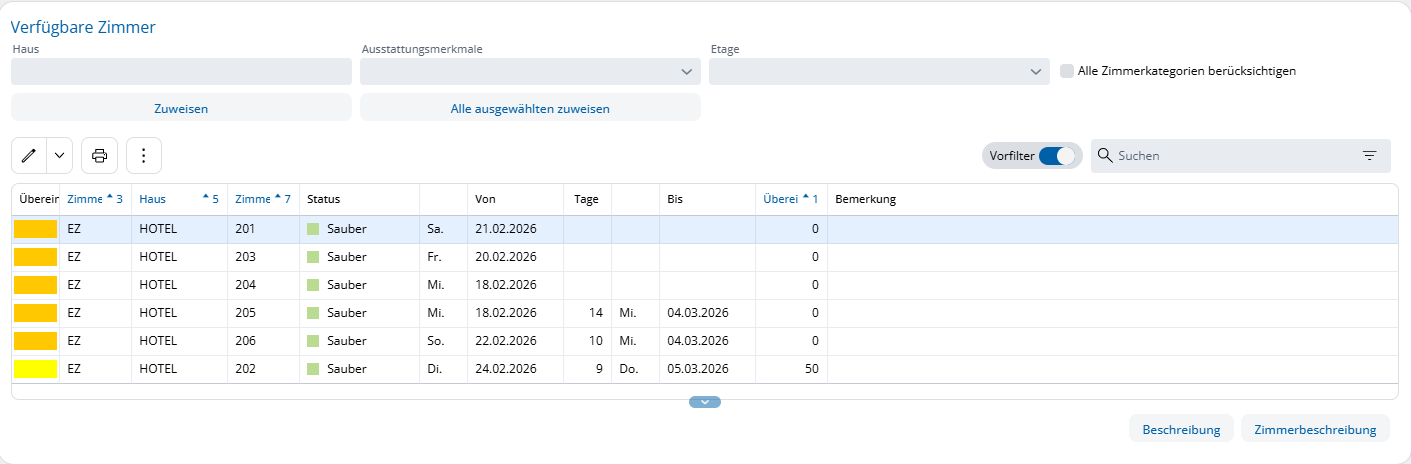 Hier werden alle Zimmer angezeigt, die den ausgewählten Reservierungen zugewiesen werden können:
