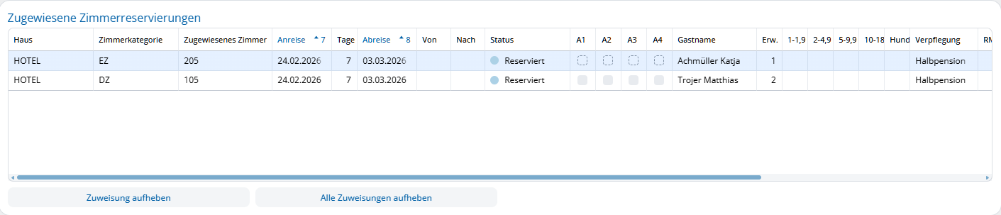 Hier werden alle erfolgreich zugewiesenen Zimmer mit Zimmernummer angezeigt. Fehlerhafte oder unerwünschte Zuweisungen können einzeln oder gesammelt wieder aufgehoben werden.