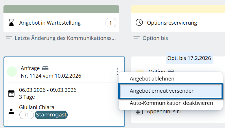 In der Karte über die 3 Punkte gibt es außerdem die Operation "Angebot erneut versenden". Dadurch wird das Angebot wieder in den Kommunikationsstatus "Angebot zu senden" zurückgeschoben.