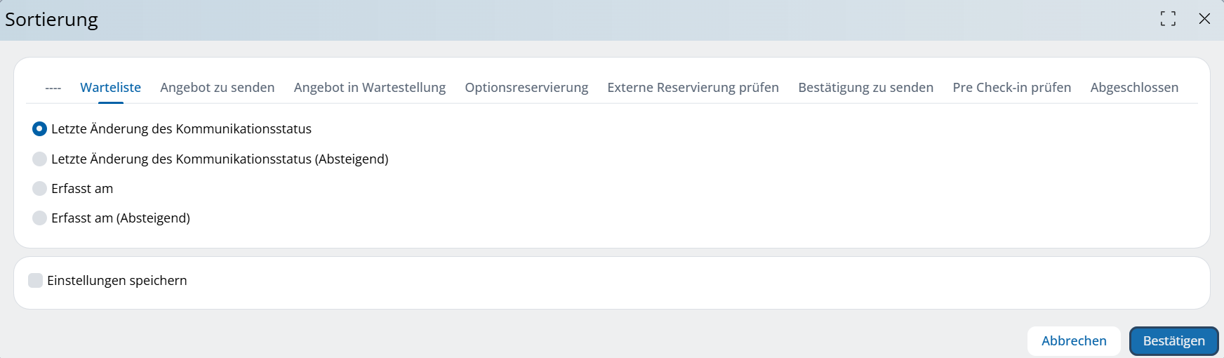 Pro Kommunikationsstatus kann eine eigene Sortierung eingestellt werden. Einfach auf das Filtersymbol klicken und die gewünschte Sortierung einstellen: