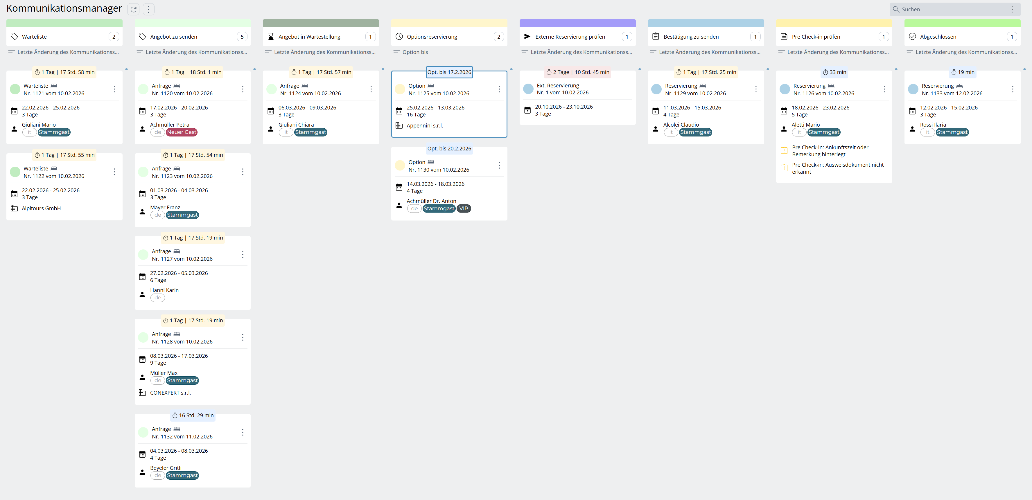 Der Kommunikationsmanager ist das zentrale Tool der Rezeption zur Verwaltung und Priorisierung aller Kommunikationsaktivitäten im Zusammenhang mit Anfragen, Angeboten, Optionen, Reservierungen und Bestätigungen. Er unterstützt, den Überblick zu behalten, offene Aufgaben gezielt abzuarbeiten und sicherzustellen, dass Gäste zeitnah ein Angebot oder eine Bestätigung erhalten. Durch die grafische Board-Ansicht ist jederzeit ersichtlich, wo sich eine Reservierung im Kommunikationsprozess befindet und wie lange sie dort bereits offen ist.