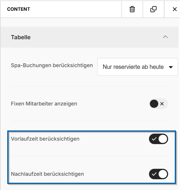 Die Einstellungen „Vorlaufzeit berücksichtigen“ und „Nachlaufzeit berücksichtigen“ wurden im Spa-Block hinzugefügt. Dadurch kann nun festgelegt werden, ob die Vor- und Nachlaufzeiten der Anwendung bei der angezeigten Dauer auch für den Gast berücksichtigt werden sollen.