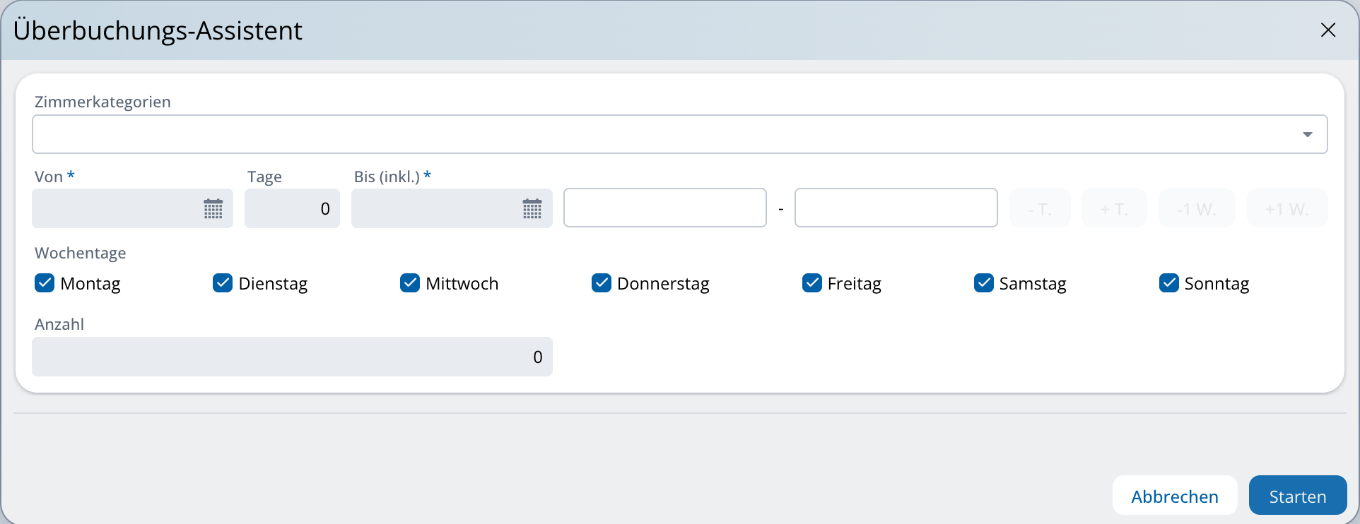 Die Zimmerkategorien wurden um die Funktion „Überbuchungsverwaltung“ erweitert. Damit kann festgelegt werden, wie viele Überbuchungen pro Zimmerkategorie erlaubt sind. Dafür gibt es eine neue Tabelle, in der pro Tag und Kategorie Werte zwischen 0 und 99 eingetragen werden können. Nur Kategorien mit aktivierter Überbuchungsverwaltung können ausgewählt werden. Die eingestellten und tatsächlichen Überbuchungen werden bei der Berechnung der freien Zimmer für Internet-Portale berücksichtigt. Außerdem werden Änderungen an Zimmern und Räumen, die nicht verfügbar sind (Out-of-Order), gespeichert.