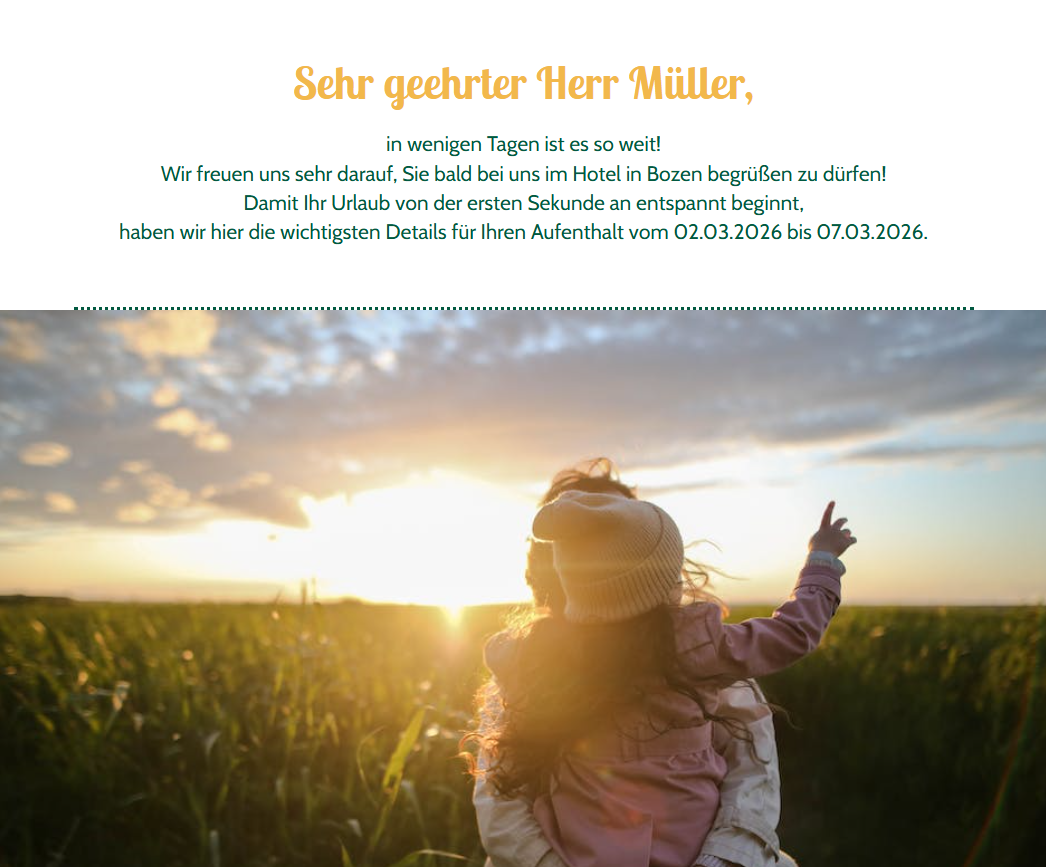 Mit dem automatischen HTML-Versand können definierte E-Mail-Typen wie Pre-Stay- und Post-Stay-Mails, Reminder, Geburtstagsgrüße, Reservierungsbestätigungen vollständig automatisiert versendet werden. Der Versand erfolgt ohne manuelles Eingreifen auf Basis konfigurierbarer Logiken (z. B. Pre-Stay 3 Tage vor Anreise, Post-Stay 2 Tage nach Abreise, Reminder 1 Tag nach Angebotsversand) und zu festgelegten Uhrzeiten. Dies ermöglicht eine zeitgenaue, konsistente und skalierbare Gästekommunikation bei gleichzeitig reduziertem manuellen Aufwand.