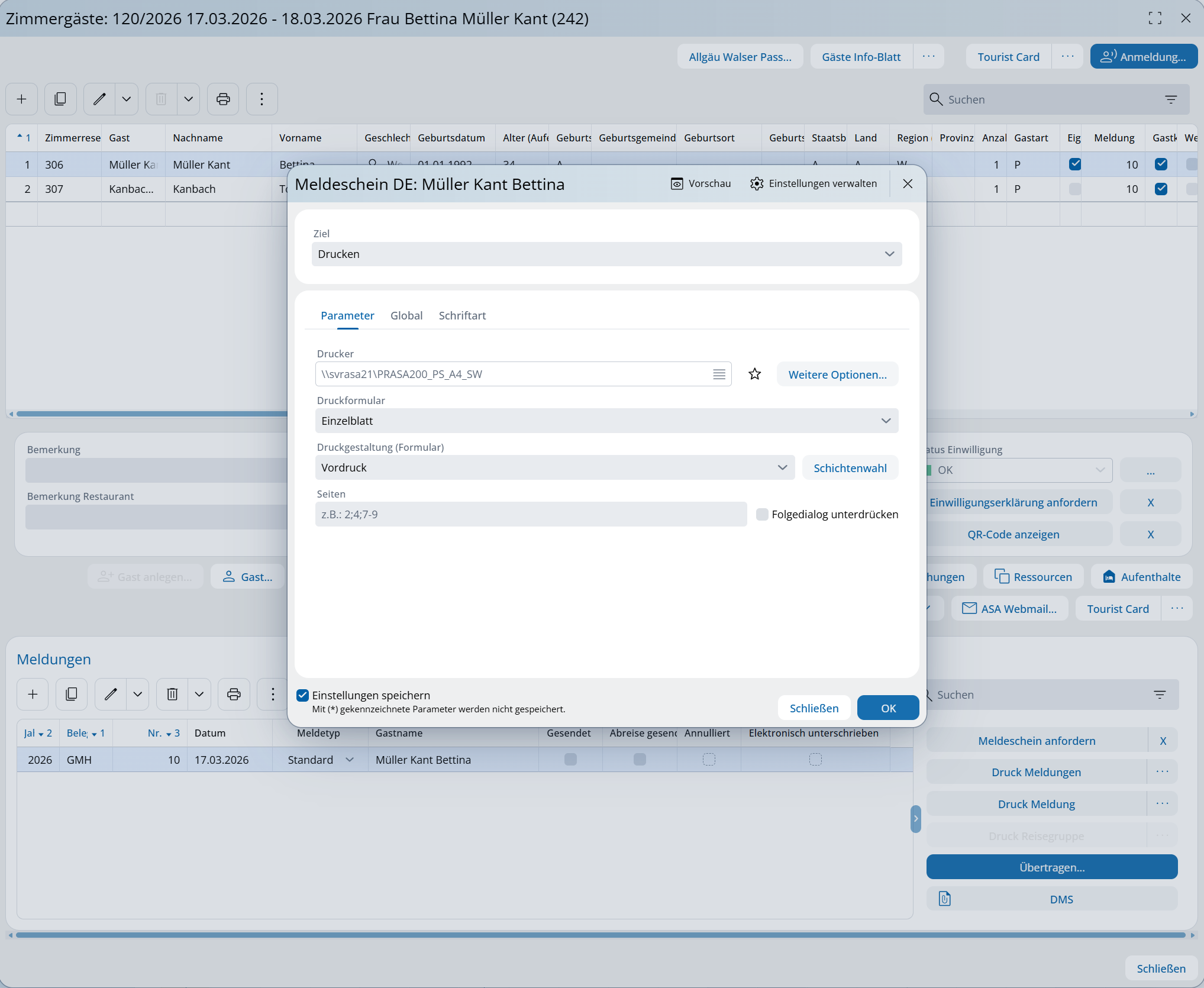 „Gästemeldung bei Anmeldung drucken“: Nach der Anmeldung der Meldegäste in der Reservierung erscheint ein Druckdialog, über den der Meldeschein direkt gedruckt werden kann.