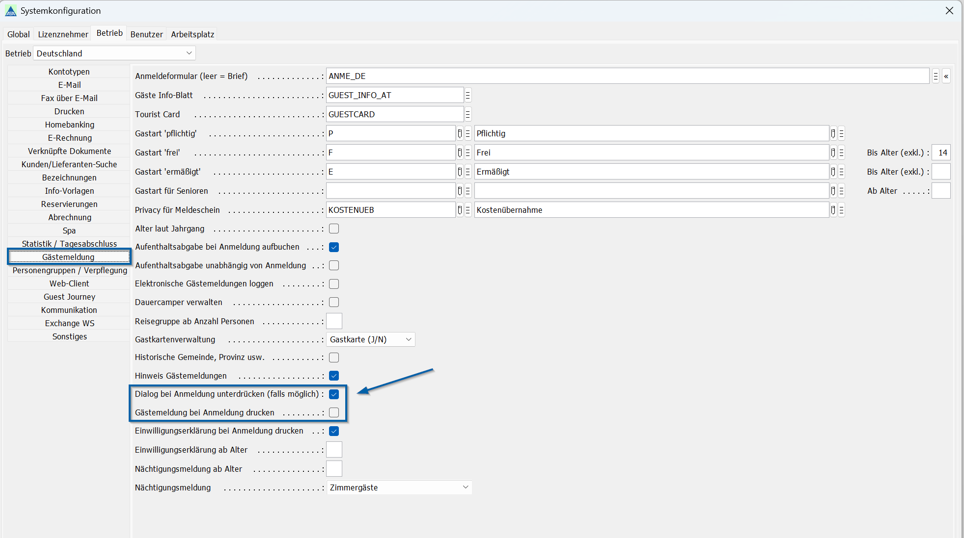 unter Betrieb → Gästemeldung zwei neue Einstellungen:- „Dialog bei Anmeldung unterdrücken (falls möglich)“: Versucht, den Dialog bei der Anmeldung der Meldegäste in der Reservierung zu unterdrücken. Haben die Meldegäste unterschiedliche Anreisedaten, wird der Dialog dennoch angezeigt.
