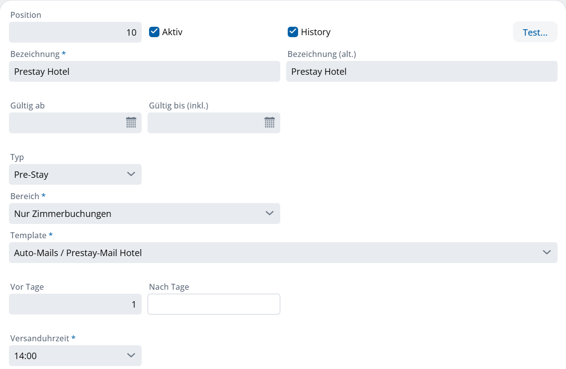 Ist dieses Flag aktiv, werden die versendeten E-Mails in der Korrespondenz der jeweiligen Reservierung bzw. des Gastes gespeichert.Test