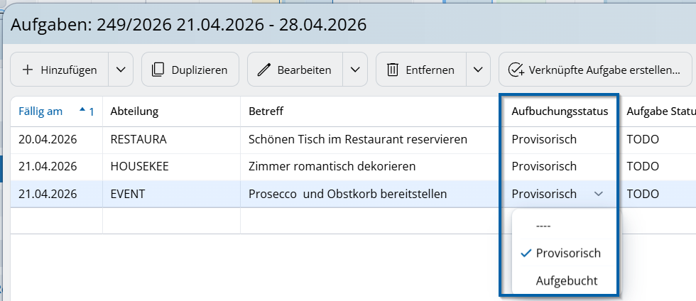 Aufgaben werden nicht direkt beim Anlegen der Reservierung sichtbar, sondern erst beim Aufbuchen der Leistungen.