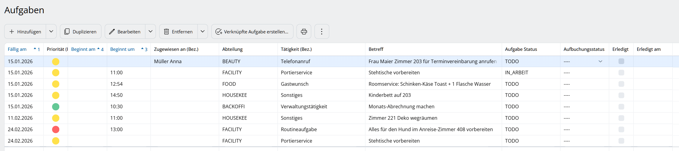 Über Filter kann der Zeitraum angepasst werden. Ein Doppelklick öffnet die Detailansicht der Aufgabe.