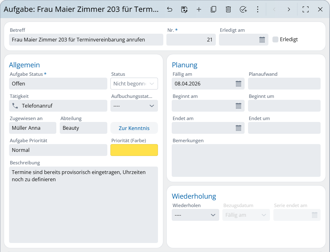 Beim Anlegen einer Aufgabe werden Betreff und Inhalte definiert. Die Aufgaben-Nummer wird automatisch vergeben. Das Feld „Erledigt am“ wird automatisch gesetzt, sobald die Aufgabe als erledigt markiert wird.