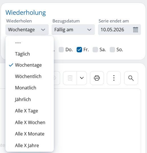 Über die Wiederholung können Serien definiert werden (z. B. täglich oder wöchentlich). Eine neue Aufgabe wird jeweils erst erzeugt, wenn die vorherige erledigt wurde oder deren Fälligkeit erreicht ist (je nach Einstellung).