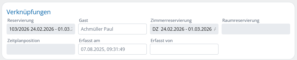 Bei Erstellung aus einer Reservierung werden die Verknüpfungen automatisch gesetzt. Bestehende Aufgaben werden in der Reservierung angezeigt.
