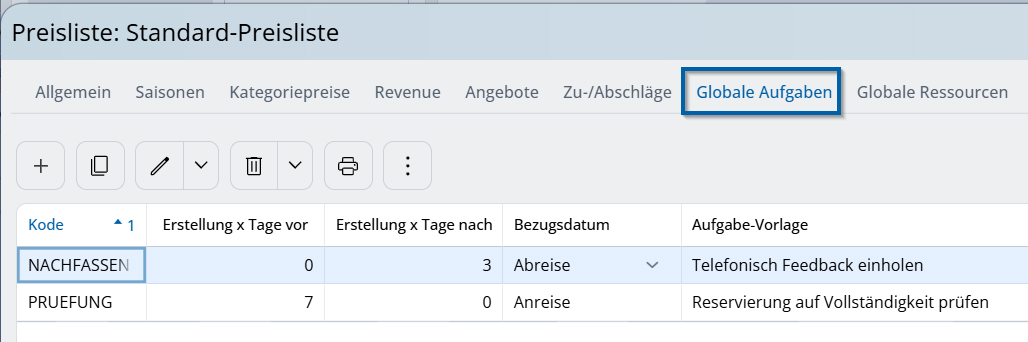 Systemkonfiguration → Hotel → Stammdaten → Preislisten → Globale Aufgaben