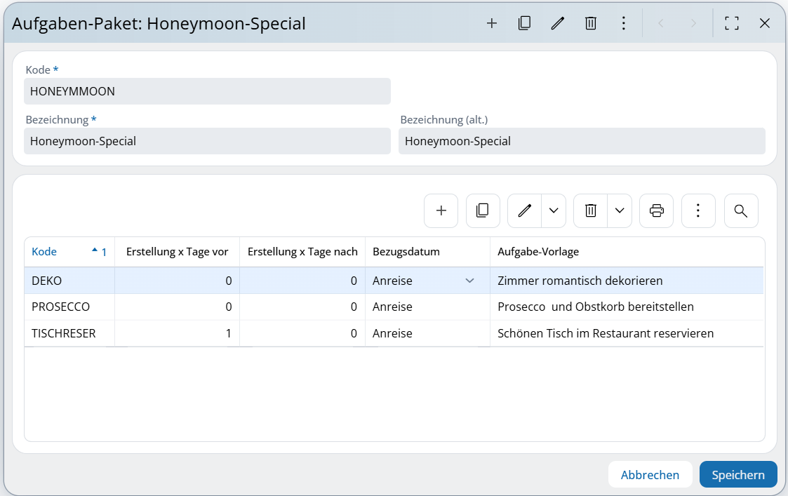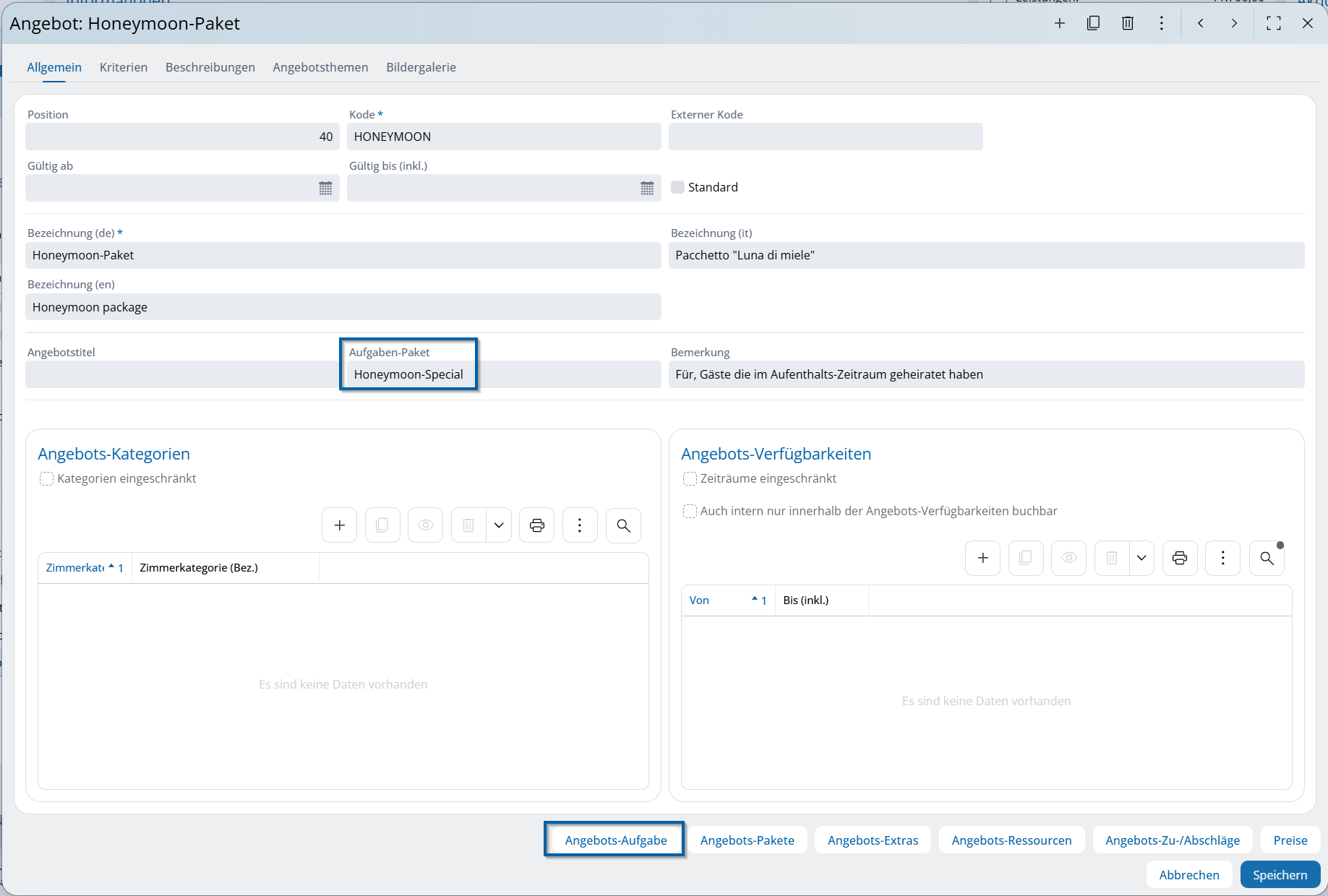 Systemkonfiguration → Hotel → Vorgaben → Aufgaben-Pakete