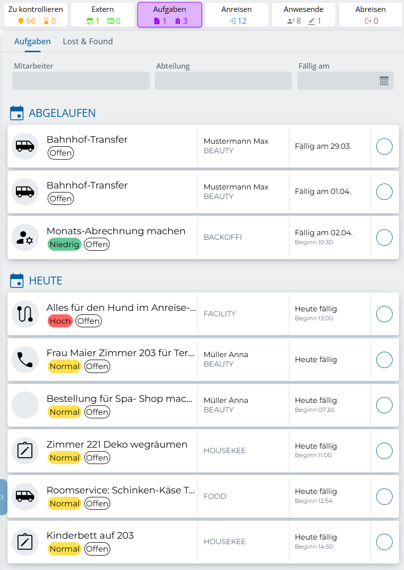 Die Quick-Infos im Zimmerplan zeigen alle relevanten Aufgaben für den eigenen Mitarbeiter bzw. die eigene Abteilung.