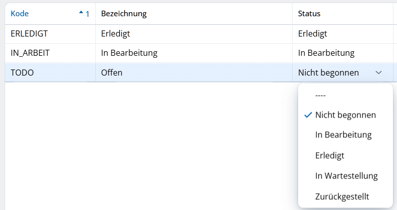 Die verfügbaren Status werden unter Allgemein → Vorgaben Verwaltung → Aufgabenstatus verwaltet. Grundlage sind systemrelevante Status-Typen wie „Nicht begonnen“, „In Bearbeitung“ oder „Erledigt“.