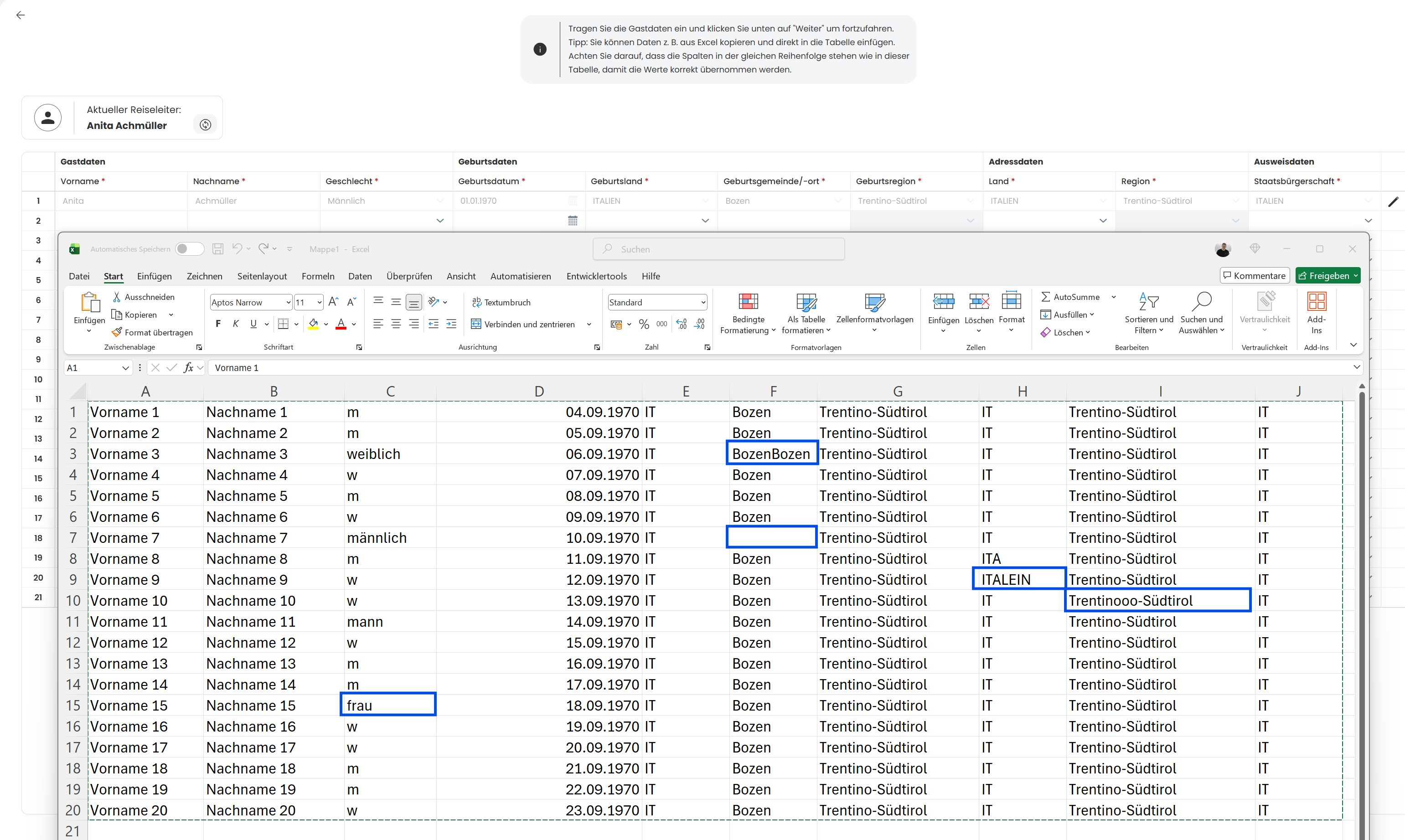 In diesem Beispiel wurden bewusst ein paar Fehler bei der Excel Datei eingetragen damit demonstriert werden kann, wie der Eingabe-Assistent funktioniert.