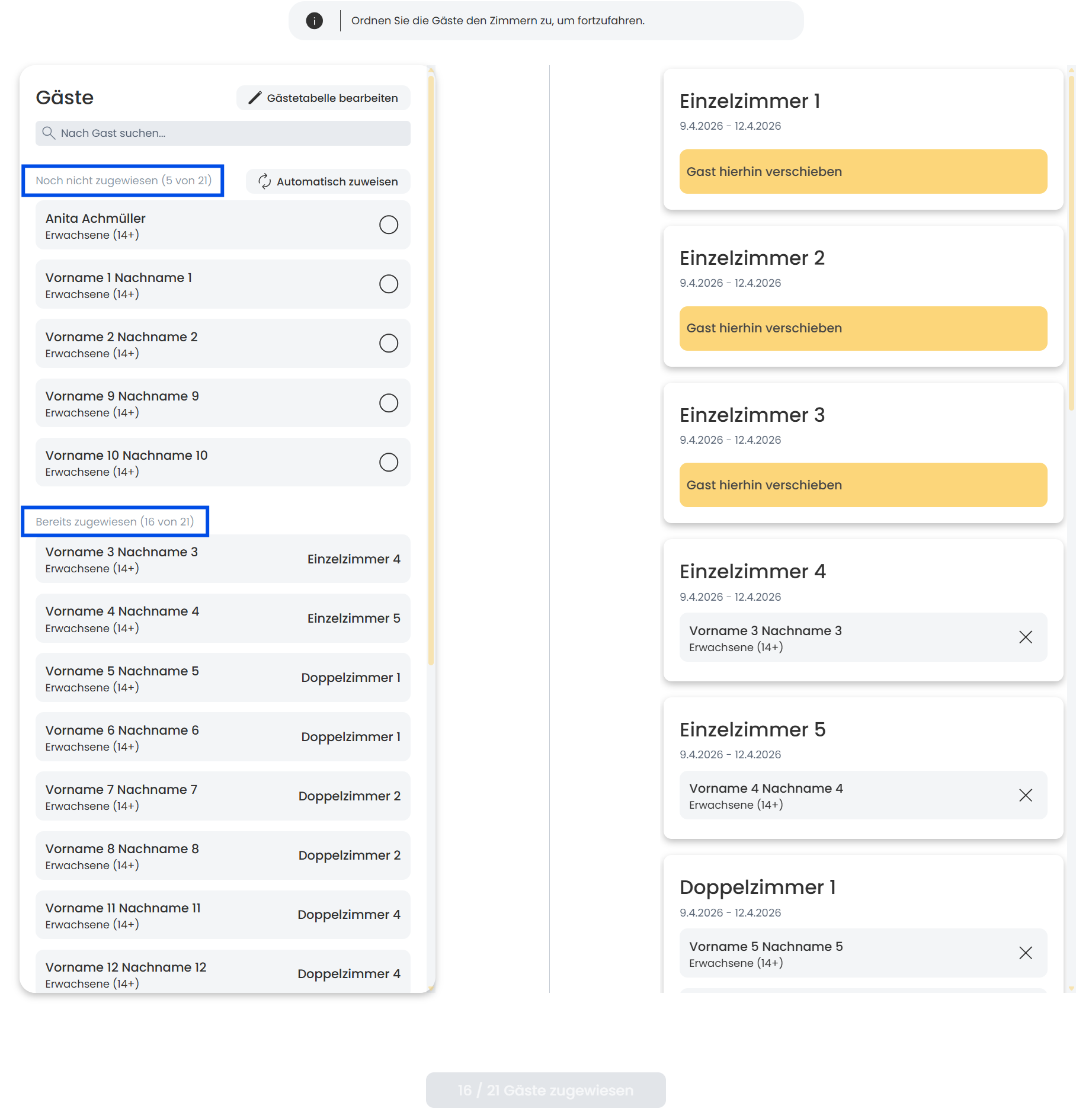 - welche Gäste bereits zugewiesen sind