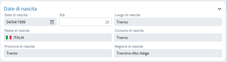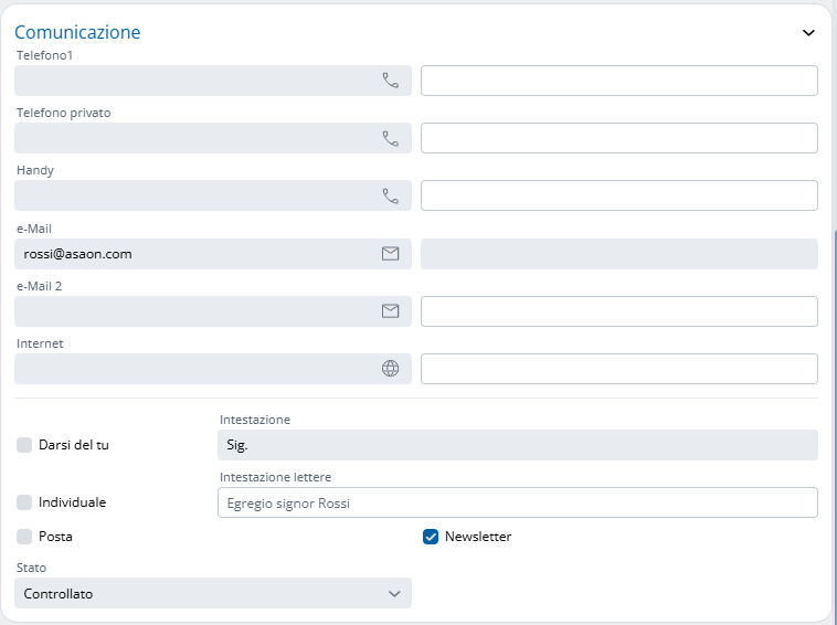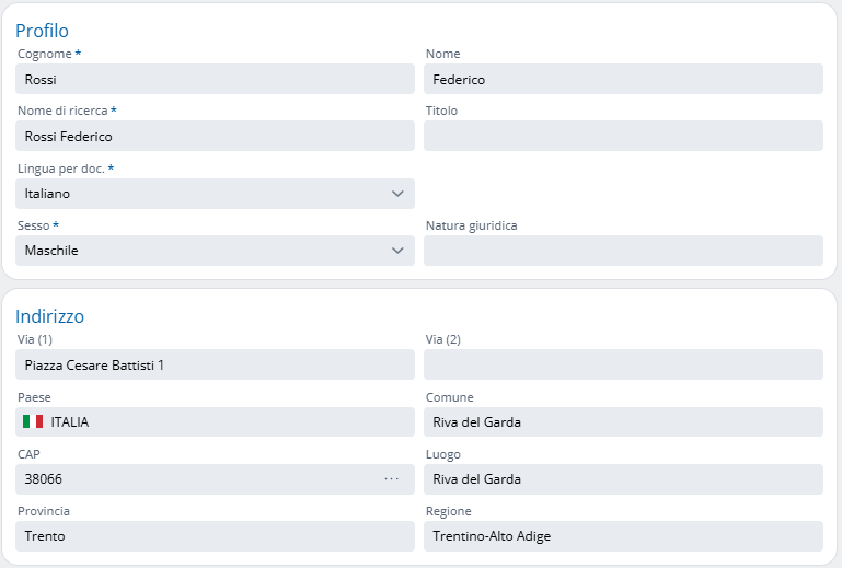 Per le persone fisiche, è possibile inserire qui la data e il luogo di nascita. Se questi dati sono richiesti anche per le comunicazioni ufficiali, potrebbe essere necessario inserire anche le voci corrispondenti per il comune, la provincia, il Paese, ecc.