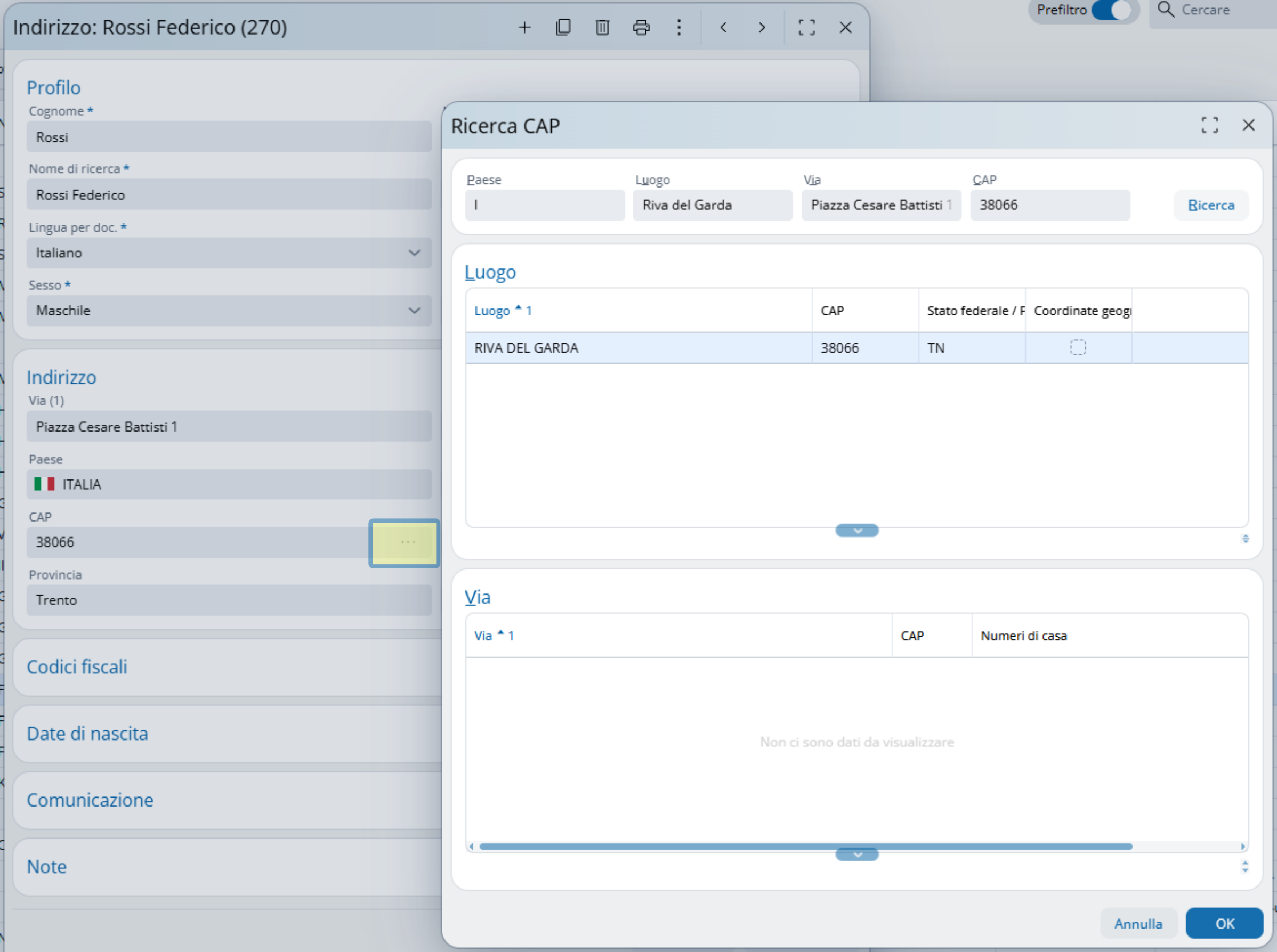 La ricerca CAP viene avviata utilizzando i tre puntini accanto al campo del CAP.