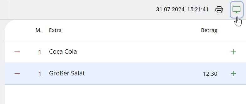 1. Accedi al Touch POS e tocca gli extra da diversi luoghi ordini. Prima d'inviare (spunta verde) questi extra, attiva il simbolo "Anteprima" nell'angolo in alto a destra.