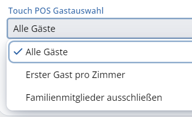 L'opzione di selezione degli ospiti del Touch POS comprende le seguenti opzioni: Tutti gli ospiti, Primo ospite per camera, Escludere i familiari. Con "Primo ospite per camera", il numero di posizione è nascosto nell'elenco degli ospiti.
