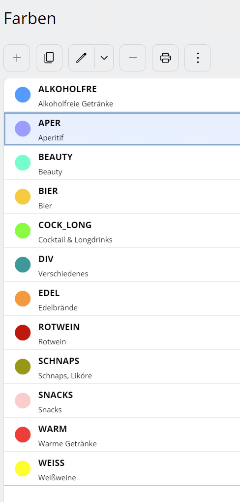 Se ci sono molti gruppi extra, questi possono anche essere suddivisi in sottogruppi (ad esempio, il gruppo extra vino rosso in sottogruppi vini rossi italiani, vini rossi altoatesini, ecc.). In questo caso, vengono disposti automaticamente in una colonna separata (accanto al gruppo Extra). Se viene specificato un punto vendita, il gruppo o sottogruppo extra viene visualizzato solo per questo punto vendita.