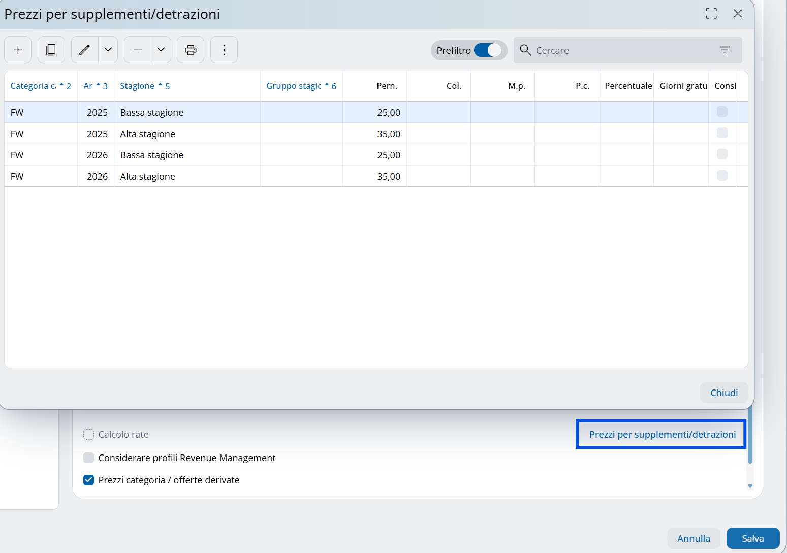 È anche possibile inserire una percentuale per i prezzi stagionali e fissi, che viene applicata al rispettivo importo.