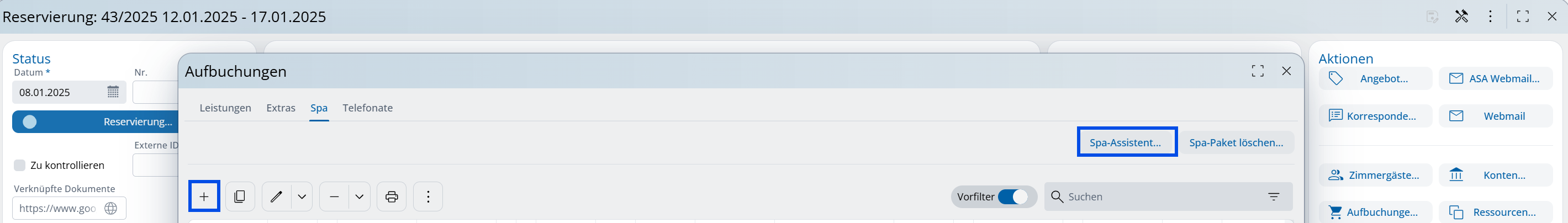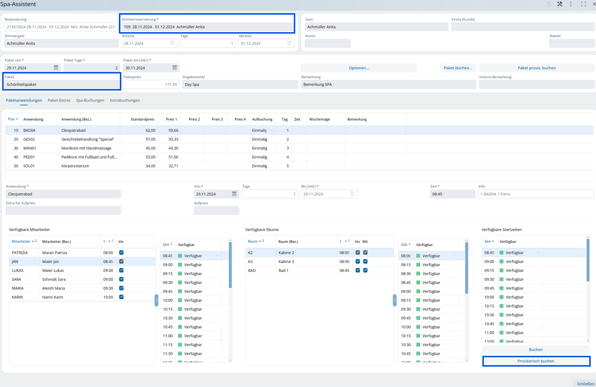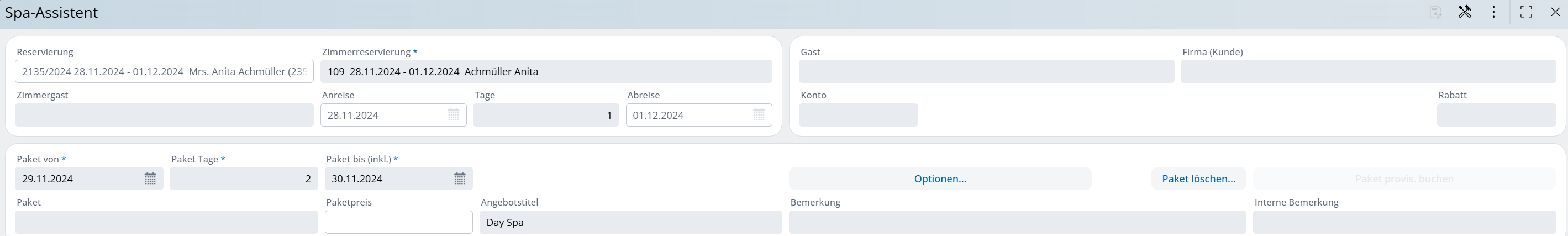 Per gli appuntamenti spa vale quanto segue: devono essere assegnati a un ospite, poiché sono strettamente personalizzati. Tuttavia, nella fase iniziale di una prenotazione, gli ospiti della camera spesso non sono ancora conosciuti per nome. Pertanto, è possibile inserire gli appuntamenti spa provvisori solo tramite una prenotazione della camera: